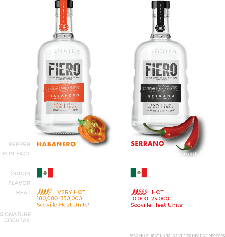 Fiero Tequila is the spiciest infused tequila in the U.S. with LOCALLY GROWN PEPPERS for a flaming agave experience. This signature tequila is made for those who never shy away from a challenge.